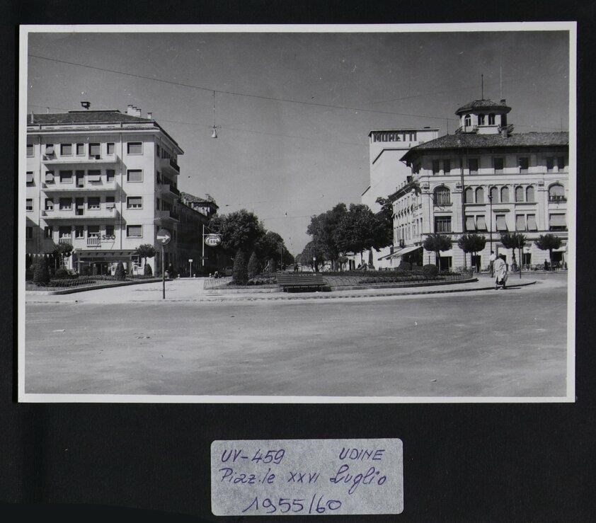 Udine: veduta di piazzale XXVI Luglio. In primo piano, al centro e a sinistra, un'aiuola. In secondo piano, a sinistra, lo stabilimento dell'azienda petrolifera Ɛsso. A destra Palazzo Moretti, annesso allo stabilimento del Birrificio Moretti, subito dietro, progettato dall'architetto Ettore Gilberti (1925-1926).