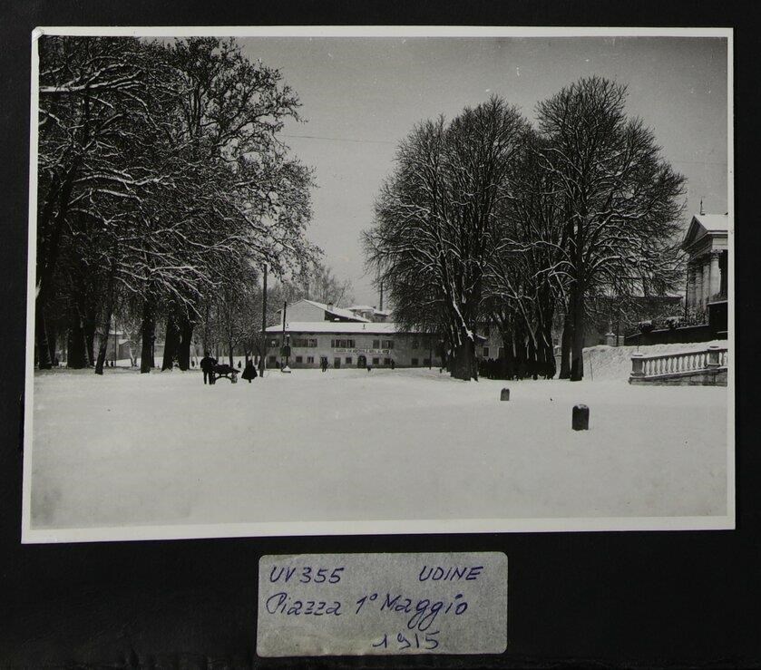 Udine: veduta di uno scorcio innevato di piazza I Maggio. A destra si intravede il pronao (1838-1841, 1850-1851), con timpano e quattro colonne (in pietra bianca di Brioni), appartenente al santuario della Beata Vergine delle Grazie. Il pronao è stato progettato dall'architetto Valentino Presani.