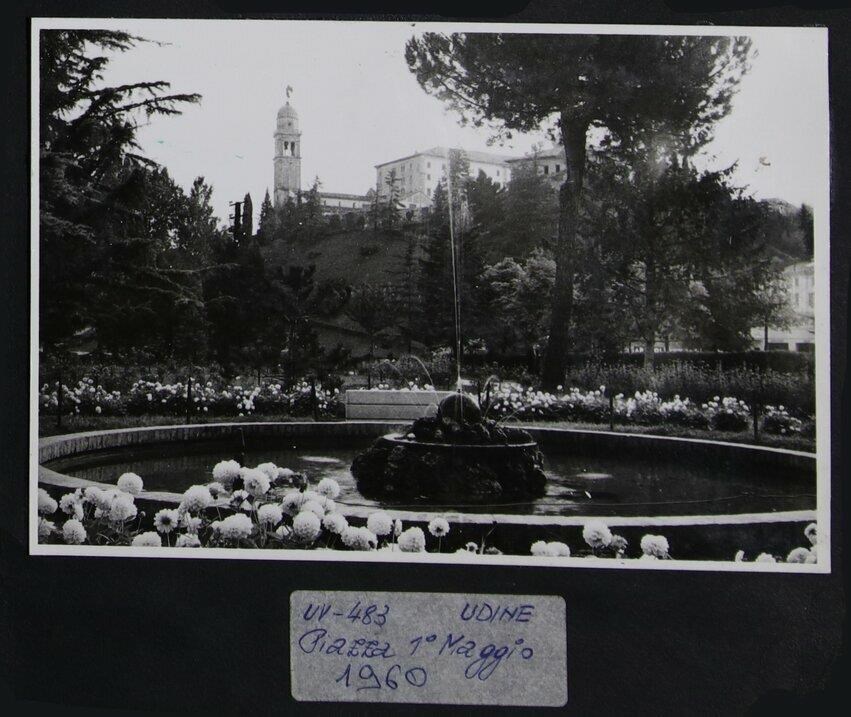 Udine: veduta di uno scorcio di piazza I Maggio con la fontana in primo piano al centro. In secondo piano, al centro, il castello e la chiesa di Santa Maria di Castello.