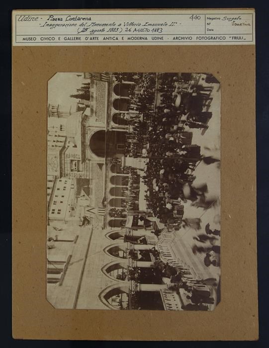 Udine: veduta di uno scorcio di piazza Contarena (piazza Libertà). A sinistra, parte della Loggia del Lionello, finita di costruire per volere di Nicolò Lionello; a destra, in lontananza, la statua seicentesca di Ercole, in pietra d'Aurisina, dello scultore Angelo de Putti. Vicino, il monumento equestre in bronzo dedicato al re Vittorio Emanuele II, collocato al centro della piazza (spostato nel 1947 nel Giardino Ricasoli): a destra, oltre a essere presente lo stendardo con l'aquila del Friuli, il vessillo del Regno. La fotografia è stata scattata il giorno dell'inaugurazione del monumento equestre, il 26 agosto 1883, a cui ha assistito una grande folla di persone. In secondo piano, la Loggia di San Giovanni, in cui si innesta la Torre dell'Orologio, di Giovanni da Udine (1527). Sullo sfondo, il castello e il campanile della chiesa di Santa Maria in Castello.