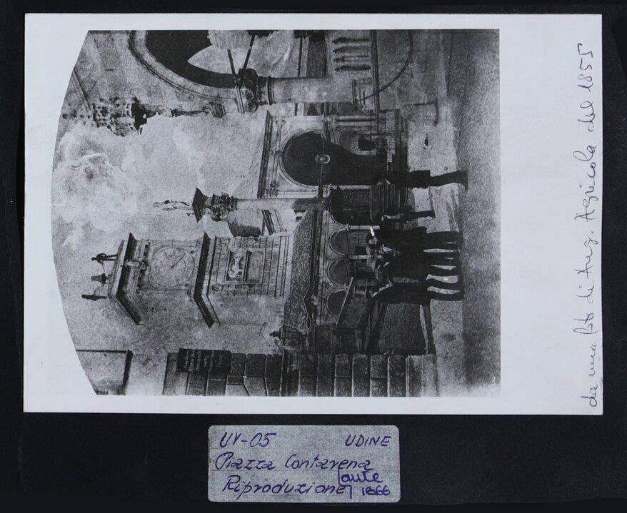 Udine: veduta di uno scorcio di piazza Contarena (piazza Libertà). A destra, una parte della Loggia del Lionello, finita di costruire per volere di Nicolò Lionello; al centro, la colonna con la statua della Giustizia, dello scultore Girolamo Paleari (1612); in secondo piano, la Loggia di San Giovanni, in cui si innesta la Torre dell'Orologio, di Giovanni da Udine (1527). In cima ad essa, i due Mori e, in mezzo a loro, una campana. In primo piano, in basso, un gruppo di sei uomini che ha visitato l'Esposizione di Arti Belle e Mestieri del 1856.