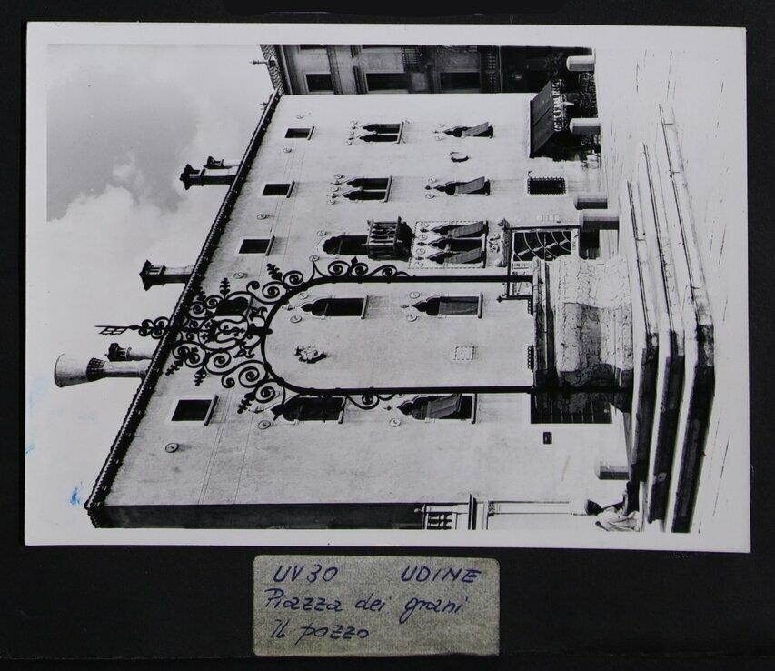 Udine: veduta di uno scorcio di piazza XX Settembre (chiamata un tempo "piazza dei grani"). In primo piano, il pozzo dell'antico Ospedale. Dietro, la Casa Veneziana, realizzata in stile gotico, in origine di proprietà dei conti di Montegnacco e posizionata in via Rialto, che nel 1910 viene smontata - per accogliere la nuova sede del Municipio - e ricomposta nel 1929 in piazza XX Settembre. In basso a sinistra, un signore che guarda verso l'obiettivo.