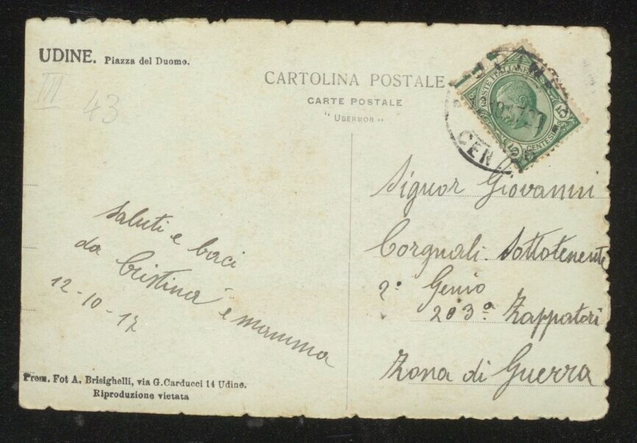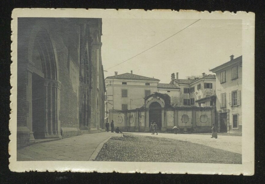 Veduta della Piazza del Duomo di Udine con, a sinistra, la facciata dell'edificio religioso, dei bambini seduti sul ciottolato e dei passanti.