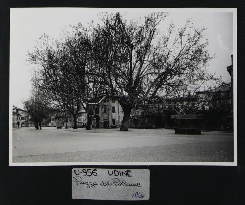 Udine: veduta di uno scorcio di via Antonio Zanon e di piazza del Pollame (o degli Uccelli), dove si faceva commercio di animali vivi, con in primo piano, al centro, un platano secolare.