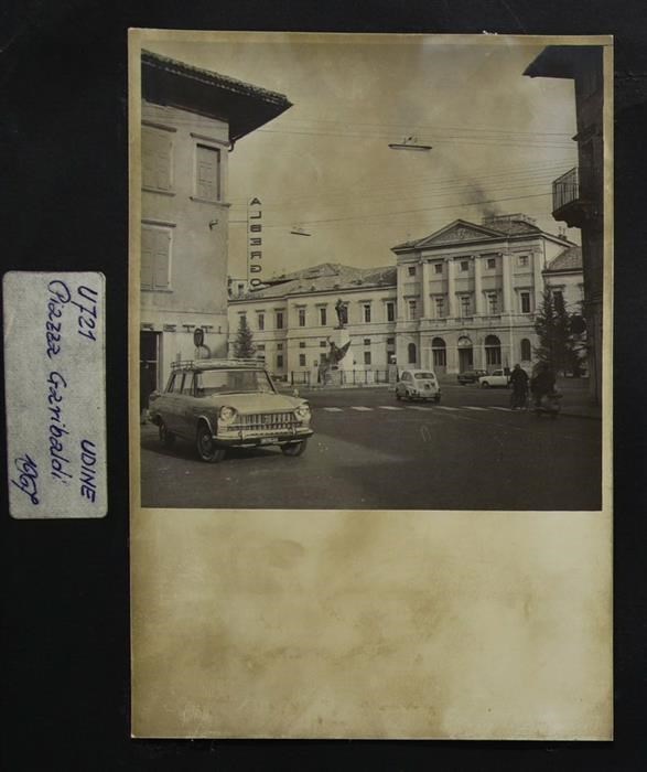 Udine: veduta di piazza Garibaldi con l'ex Istituto superiore a carattere tecnico (1866) intitolato ad Antonio Zanon nel 1883; da metà Novecento circa l'edificio è sede della Scuola Media Statale "Alessandro Manzoni". In secondo piano a sinistra, il monumento a Garibaldi di Guglielmo Michieli, inaugurato il 28 agosto 1886. Sui gradoni si erge una statua in bronzo di un garibaldino che solleva una tromba e tiene in mano la bandiera; sul piedistallo, la statua in bronzo di Giuseppe Garibaldi ha in mano una spada. A sinistra, l'insegna verticale di Al Vecchio Tram, trattoria con alloggio aperta negli anni Cinquanta.