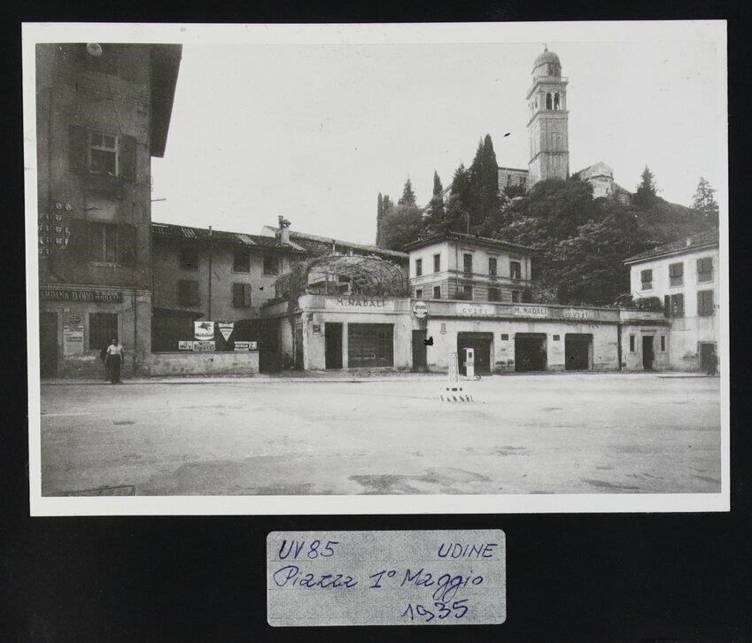 Udine: veduta di uno scorcio di piazza I Maggio. In secondo piano, a destra, il castello e il campanile della chiesa di Santa Maria di Castello. Davanti, degli edifici recanti l'insegna "M. NADALI". A sinistra, l'insegna del ristorante pizzeria Campana d'Oro e un uomo vicino all'ingresso. Su alcune pareti e recinzioni sono affissi manifesti pubblicitari.