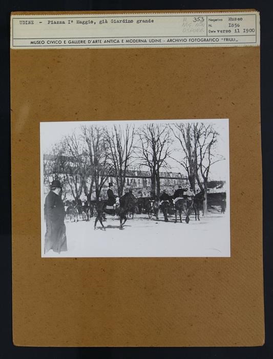 Udine: veduta di piazza I Maggio. Diversi uomini a cavallo, tra cui alcuni in divisa.