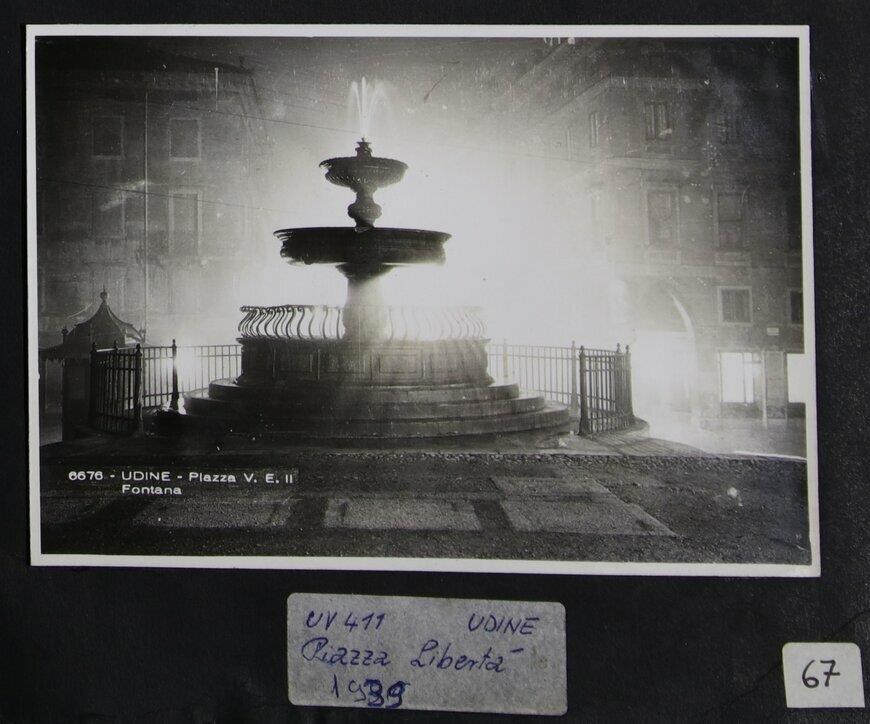 Udine, piazza Libertà: veduta della fontana di Giovanni Carrara (anni Quaranta del Cinquecento). La didascalia in basso a sinistra recita "6676 - UDINE - Piazza V.E. II./ Fontana". Da dietro, un bagliore di luce.