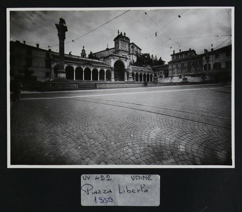 Udine: veduta di piazza Libertà. Nella piazza sono presenti la fontana di Giovanni Carrara (anni Quaranta del Cinquecento), la colonna corinizia (1539) con il leone della Repubblica di Venezia, le statue seicentesche di Ercole e di Caco (di Angelo de Putti), il monumento alla Pace di Giovanni Battista Comolli (trasportato a Udine nel 1819) e la colonna con la statua della Giustizia di Girolamo Paleari (1612). In secondo piano, al centro, la Loggia di San Giovanni, in cui si innesta la Torre dell'Orologio, di Giovanni da Udine (1527). In cima alla Torre, i due Mori e, in mezzo a loro, una campana. Dietro alla loggia, in secondo piano, si intravede l'arco Bollani di Andrea Palladio (1556), costruito in bugnato per volere del luogotenente veneto Domenico Bollani. Sullo sfondo, il castello e il campanile della chiesa di Santa Maria di Castello. All'estrema sinistra, Palazzo Filittini-Caimo-Dragoni (dal 1926 sede del Credito Italiano), che subì degli interventi alla fine dell'Ottocento.
