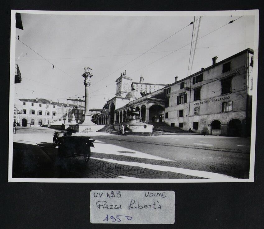 Udine: veduta di piazza Libertà con in primo piano a sinistra una carrozza. Nella piazza sono presenti la fontana di Giovanni Carrara (anni Quaranta del Cinquecento), la colonna corinizia (1539) con il leone della Repubblica di Venezia, le statue seicentesche di Ercole e di Caco (di Angelo de Putti), il monumento alla Pace di Giovanni Battista Comolli (trasportato a Udine nel 1819) e la colonna con la statua della Giustizia di Girolamo Paleari (1612). In secondo piano, al centro, la Loggia di San Giovanni, in cui si innesta la Torre dell'Orologio, di Giovanni da Udine (1527). In cima alla Torre, i due Mori e, in mezzo a loro, una campana. Sullo sfondo, il castello. All'estrema destra, Palazzo Filittini-Caimo-Dragoni (dal 1926 sede del Credito Italiano), che subì degli interventi alla fine dell'Ottocento.