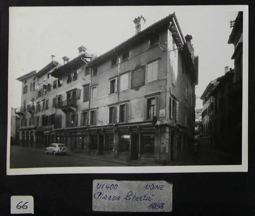 Udine: veduta di uno scorcio di piazza Libertà. Al piano terra dell'edificio, un negozio di abbigliamento. A destra si intravede il palazzo con il cinema Eden in stile liberty, costruito su progetto dell'architetto Provino Valle (1921) e in demolizione nel 1958.