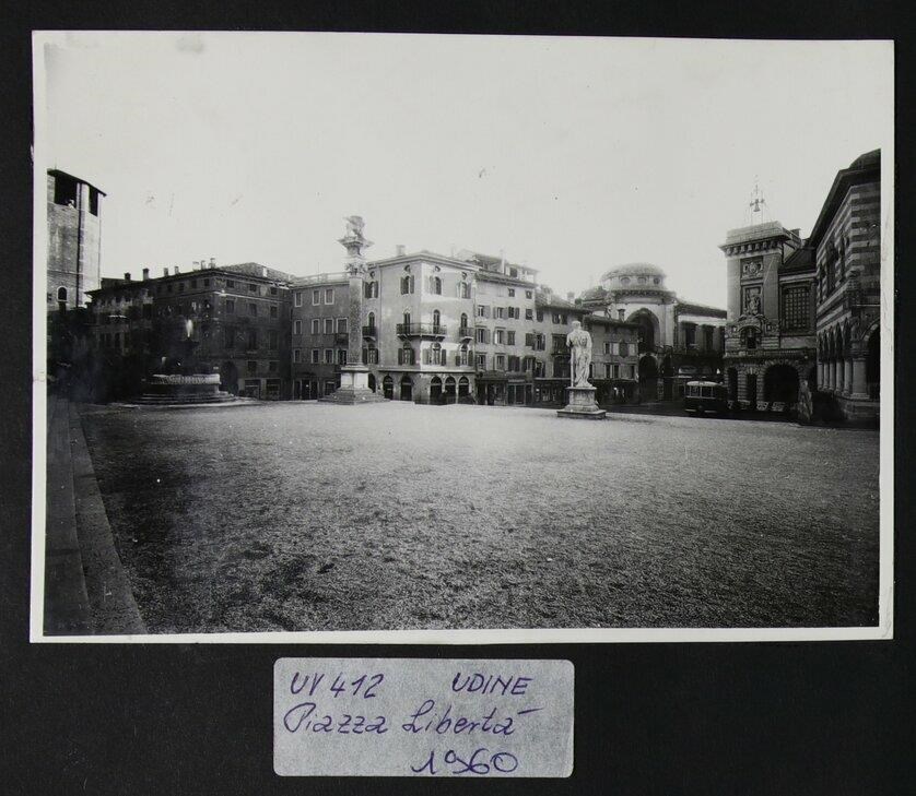 Udine: veduta di piazza Libertà, in cui si vedono la statua seicentesca di Caco in pietra d'Aurisina, realizzata dallo scultore Angelo de Putti, la colonna corinizia (1539) con il leone della Repubblica di Venezia, posizionato sulla sopracitata colonna nel 1883, e la fontana di Giovanni Carrara (anni Quaranta del Cinquecento). In secondo piano a destra si intravedono la Loggia del Lionello, finita di costruire per volere di Nicolò Lionello, il palazzo del Comune o Palazzo D'Aronco (1911-1930) con la campana d'arengo (1419), posta sul lato meridionale, in corrispondenza del caffè Contarena, e il cinema Eden in stile liberty, costruito su progetto dell'architetto Provino Valle (1921) e demolito nel 1958. All'estrema sinistra, il campanile del duomo (prima metà del Duecento).
