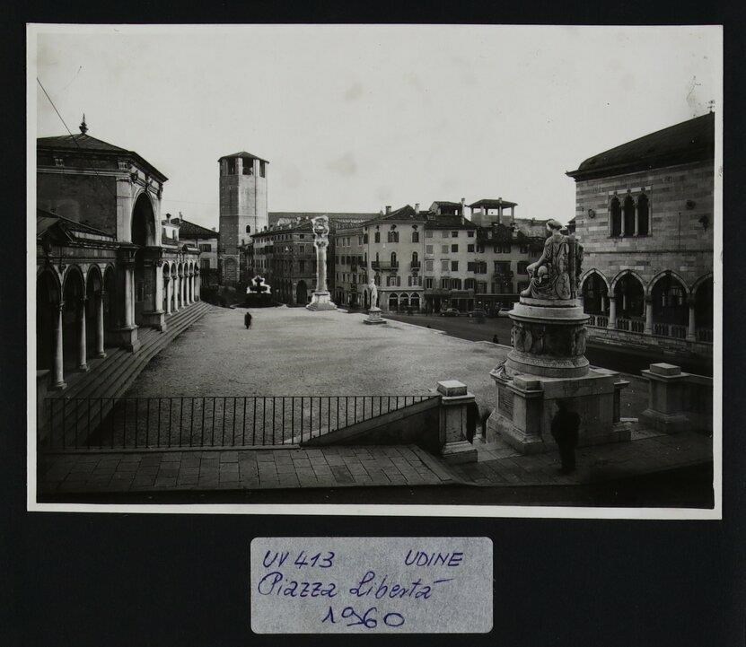 Udine: veduta di piazza Libertà, in cui si vedono la statua seicentesca di Caco in pietra d'Aurisina realizzata dallo scultore Angelo de Putti, la colonna corinizia (1539) con il leone della Repubblica di Venezia posizionato sulla sopracitata colonna nel 1883, la fontana di Giovanni Carrara (anni Quaranta del Cinquecento), la Loggia di San Giovanni in cui si innesta la Torre dell'Orologio di Giovanni da Udine (1527) e, in primo piano a destra, il monumento alla Pace (in riferimento al Trattato di Campoformido) di Giovanni Battista Comolli (trasportato a Udine nel 1819). In secondo piano a destra si intravede la Loggia del Lionello, finita di costruire per volere di Nicolò Lionello. A sinistra, il campanile del duomo (prima metà del Duecento).