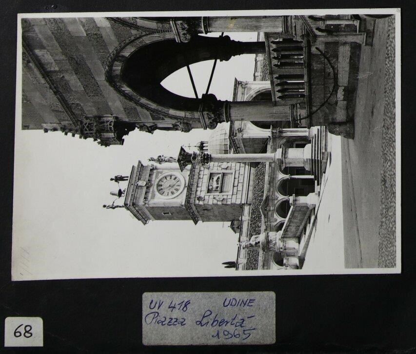 Udine: veduta di uno scorcio di piazza Libertà. In primo piano a destra, una parte della Loggia del Lionello, finita di costruire per volere di Nicolò Lionello; al centro, la colonna con la statua della Giustizia, dello scultore Girolamo Paleari (1612); in secondo piano, la Loggia di San Giovanni, in cui si innesta la Torre dell'Orologio, di Giovanni da Udine (1527). In cima ad essa, i due Mori e, in mezzo a loro, una campana. A sinistra, il monumento alla Pace (in riferimento al Trattato di Campoformido) di Giovanni Battista Comolli (trasportato a Udine nel 1819).