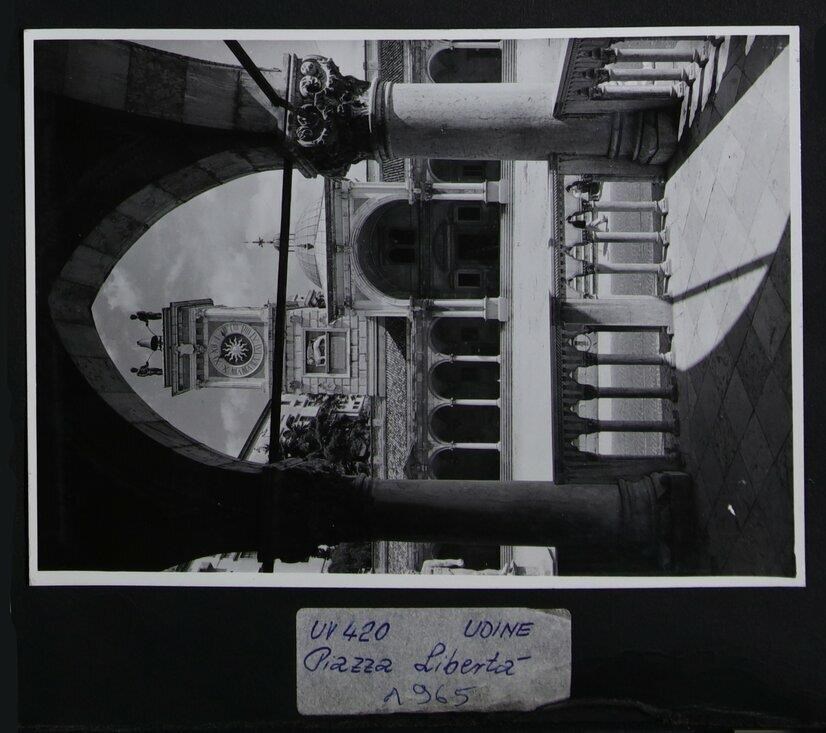 Udine, piazza Libertà: in primo piano, una parte della Loggia del Lionello, finita di costruire per volere di Nicolò Lionello, vista dall'interno. Sono parte costituente della struttura gli archi a sesto acuto e le colonne con capitello di ordine corinzio. In secondo piano, al centro, la Loggia di San Giovanni in cui si innesta la Torre dell'Orologio di Giovanni da Udine (1527). Dietro, a sinistra, si intravede il castello.