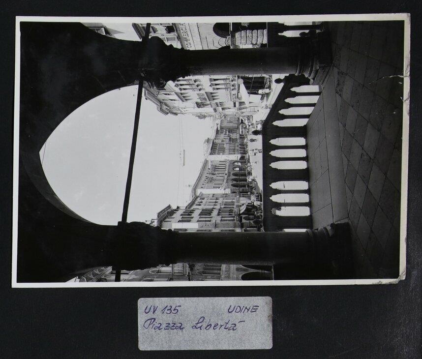 Udine: veduta di uno scorcio di via Mercatovecchio, dall'interno della Loggia del Lionello, finita di costruire per volere di Nicolò Lionello. In secondo piano a sinistra, Palazzo Sacchia (dei primi anni del Cinquecento), con portico costituito da quattro archi. In secondo piano verso il centro, la facciata del palazzo cinquecentesco del Monte di Pietà, con portico in bugnato e trifore presenti nel piano nobile, su cui sono stati effettuati degli interventi (seconda metà del XVII secolo). Agli angoli, delle sculture in marmo che rappresentano la Pietà. In secondo piano a destra, Palazzo Tealdi-Campiutti-Dorta, di origine quattrocentesca, acquistato dai Dorta dopo il 1864: qui si stabilì il caffè Dorta (nel 1879 ‘Caffè e premiata Pasticceria e confetteria Pietro Dorta & C.’), che venne chiuso nel 1958.