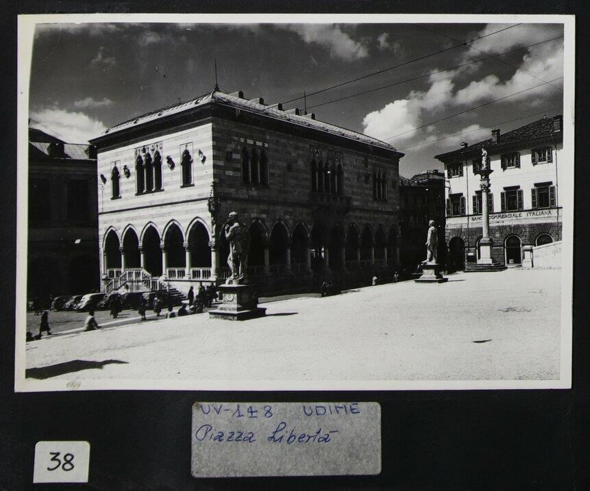 Udine: veduta di uno scorcio di piazza Libertà. Nella piazza sono presenti, da sinistra a destra: le statue seicentesche di Ercole e di Caco in pietra d'Aurisina (realizzate dallo scultore Angelo de Putti) e la colonna con la statua della Giustizia, dello scultore Girolamo Paleari (1612). In secondo piano a sinistra, la Loggia del Lionello, finita di costruire per volere di Nicolò Lionello, e automobili d'epoca parcheggiate. Sempre a sinistra, il palazzo del Comune o Palazzo D'Aronco (1911-1930). A destra, in secondo piano, la Banca Commerciale Italiana.