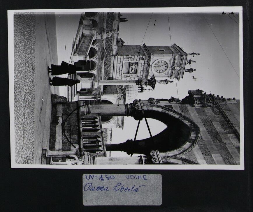 Udine: veduta di uno scorcio di piazza Vittorio Emanuele II (piazza Libertà). In primo piano a destra, la Loggia del Lionello, finita di costruire per volere di Nicolò Lionello. Verso il centro, in secondo piano, la colonna con la statua della Giustizia, dello scultore Girolamo Paleari (1612). A sinistra, il monumento alla Pace (in riferimento al Trattato di Campoformido) di Giovanni Battista Comolli (trasportato a Udine nel 1819). Ancora dietro, la Loggia di San Giovanni, in cui si innesta la Torre dell'Orologio, di Giovanni da Udine (1527). In cima alla Torre, i due Mori e, in mezzo a loro, una campana.