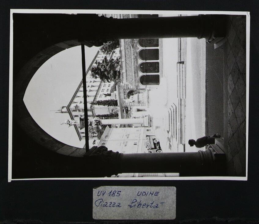Udine: veduta, inquadrata da due colonne corinzie, di uno scorcio di piazza Libertà dall'interno della Loggia del Lionello, finita di costruire per volere di Nicolò Lionello. Accanto alla colonna di sinistra, in primo piano, una donna di profilo. A sinistra, la colonna con la statua della Giustizia, dello scultore Girolamo Paleari (1612). Subito dietro, il monumento alla Pace (in riferimento al Trattato di Campoformido) di Giovanni Battista Comolli (trasportato a Udine nel 1819) e l'arco Bollani di Andrea Palladio (1556), costruito in bugnato per volere del luogotenente veneto Domenico Bollani. Sullo sfondo, al centro, il castello.