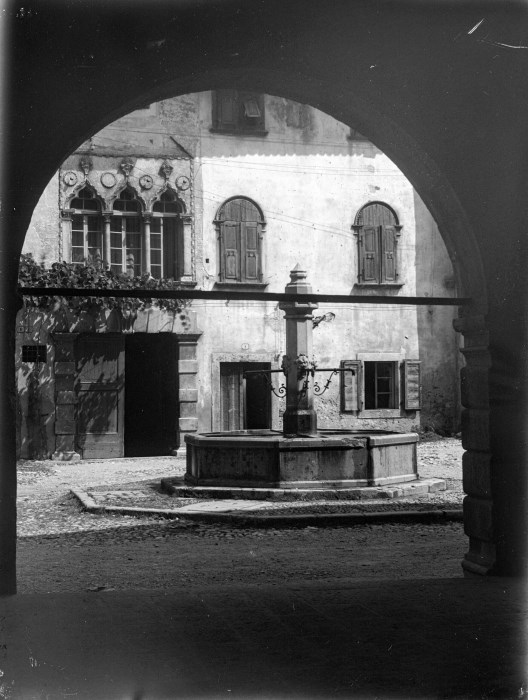 Veduta di Piazza Municipio di Venzone, della fontana e dei palazzi. Il punto di ripresa però e all'interno della loggia del Palazzo Comunale dove l'arco forma i limiti per un quadro sulla piazza antistante.