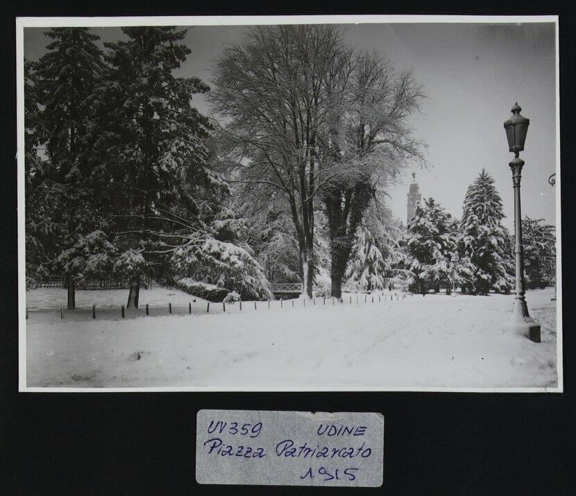 Udine: veduta di uno scorcio innevato di piazza Patriarcato. In primo piano a destra, un lampione. Sullo sfondo a destra, la scultura dorata e girevole con l'arcangelo Gabriele in cima alla cupola emisferica, portata a termine da Giovanni da Udine, appartenente al campanile cinquecentesco della chiesa di Santa Maria di Castello, progettato da Gaspare Negro.