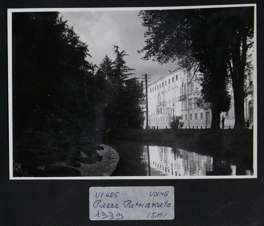Udine: veduta di uno scorcio di piazza Patriarcato. In primo piano, la roggia di Palma. A destra, palazzo Patriarcale o Arcivescovile (degli inizi del Settecento) in prospettiva.