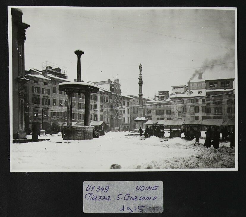 Udine: veduta di uno scorcio innevato di piazza Giacomo Matteotti durante il mercato, frequentato da diverse persone. A sinistra, un pozzo a pianta poligonale con edicola e colonne (1486). All'estrema sinistra, la chiesa di San Giacomo (fine del Trecento). Verso il centro, in secondo piano, la colonna della Madonna con il Bambino (1487).