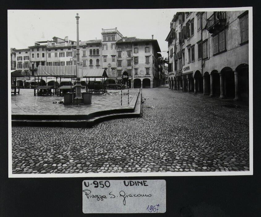Udine: veduta di piazza Giacomo Matteotti con alcuni chioschi del mercato, in fase di allestimento.