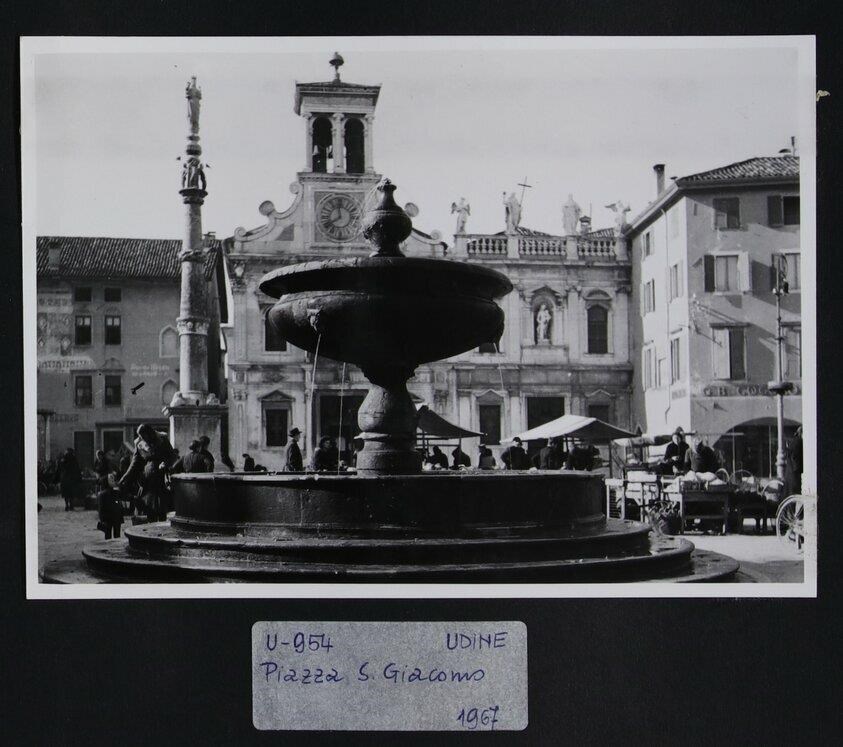 Udine: veduta di piazza Giacomo Matteotti, gremita di persone per il mercato. In primo piano, la fontana di Giovanni da Udine (1543); subito dietro, la colonna della Madonna con il Bambino (1487). Sullo sfondo, la facciata della chiesa di San Giacomo (fine del Trecento).