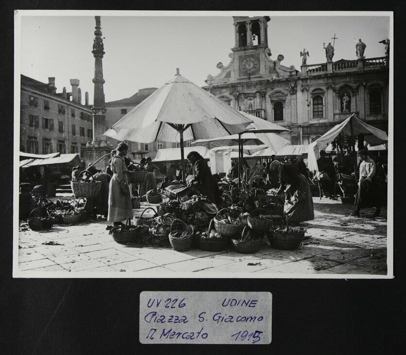 Udine: veduta di uno scorcio di piazza Giacomo Matteotti durante il mercato, frequentato da diverse persone che hanno collocato i prodotti in vendita in diversi cesti (in primo piano, le verdure). In secondo piano, la chiesa di San Giacomo (fine del Trecento). In secondo piano a sinistra si intravede un pozzo a pianta poligonale con edicola e colonne (1486). Poco distante, la colonna della Madonna con il Bambino (1487).