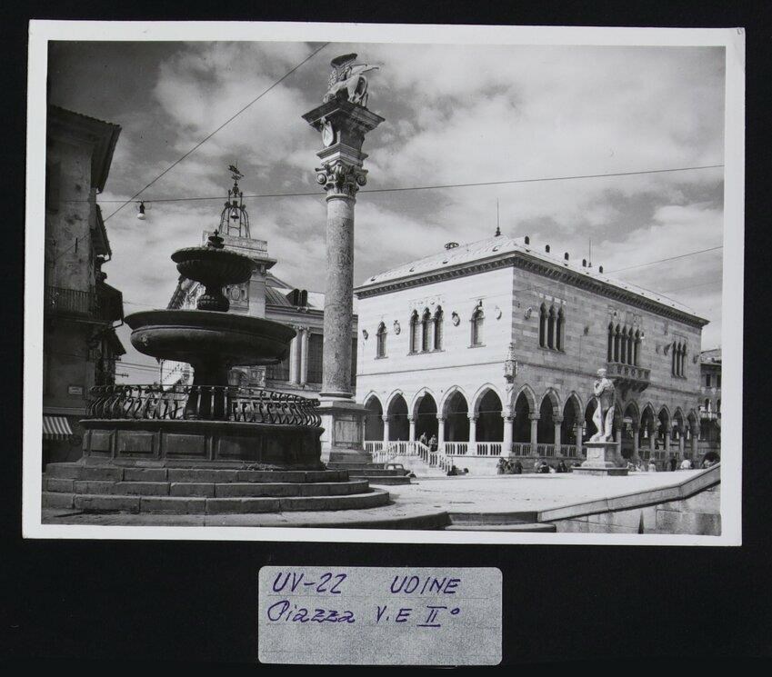 Udine: veduta di piazza Vittorio Emanuele II (piazza Libertà). In primo piano a sinistra, la fontana di Giovanni Carrara (anni Quaranta del Cinquecento). Accanto, la colonna corinizia (1539) con il leone della Repubblica di Venezia, posizionato sulla sopracitata colonna nel 1883. Dietro, uno scorcio del palazzo del Comune o Palazzo D'Aronco (1911-1930) con la campana d'arengo (1419), posta sul lato meridionale, in corrispondenza del caffè Contarena. A destra, la statua di Ercole in pietra d'Aurisina dello scultore Angelo de Putti. Subito dietro, la Loggia del Lionello, finita di costruire per volere di Nicolò Lionello.