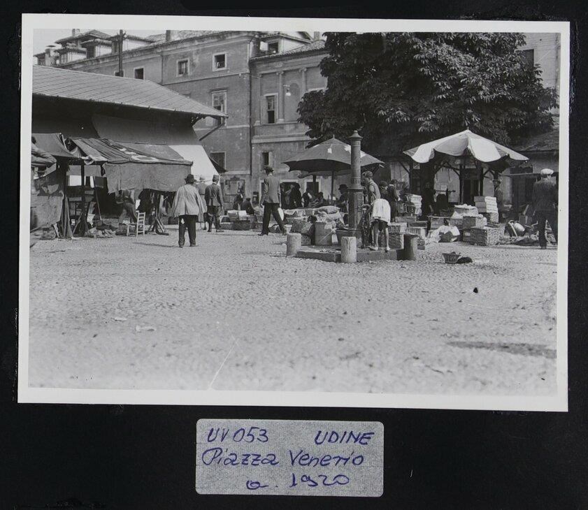 Udine, piazza Venerio: scena di mercato all’ingrosso dei prodotti ortofrutticoli. Viene organizzato il mercato lì fino al 1935. A sinistra, una tettoia; a destra, due ombrelloni.