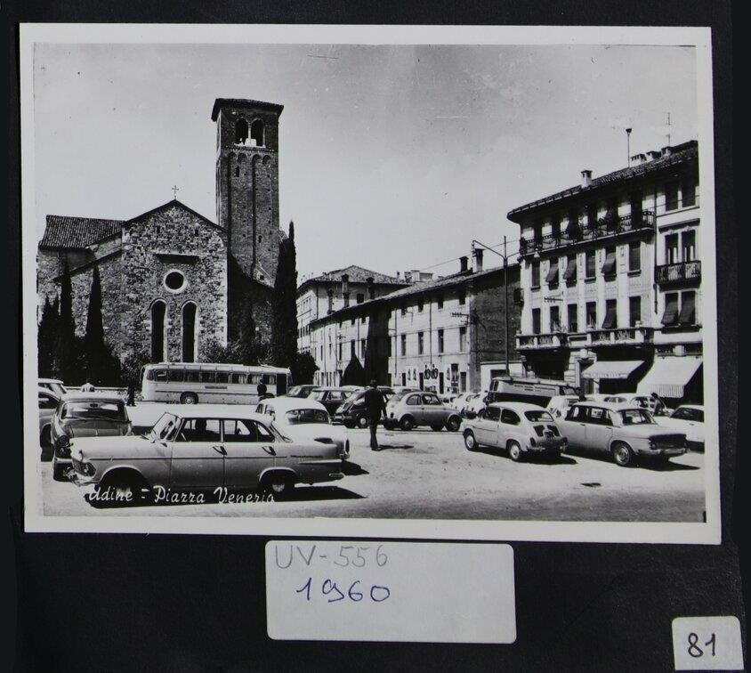 Udine: veduta di piazza Venerio (ex piazza Venezia) con automobili parcheggiate. In secondo piano a sinistra, la chiesa di San Francesco (seconda metà del XIII secolo) e un autobus. In basso a sinistra, didascalia stampata sull'immagine: "Udine - Piazza Venezia".