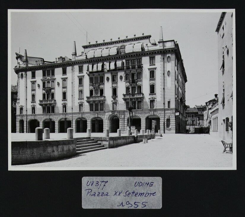 Udine: veduta di una parte di piazza XX Settembre (chiamata un tempo "piazza dei grani"). A destra, la Casa Veneziana, realizzata in stile gotico, in origine di proprietà dei conti di Montegnacco e posizionata in via Rialto, che nel 1910 viene smontata - per accogliere la nuova sede del Municipio - e ricomposta nel 1929 in piazza XX Settembre. Davanti, Palazzo INA, realizzato su progetto di Provino Valle con la collaborazione di Pietro Valle (1921-1924); si noti il portico del pianoterra, contraddistinto dal bugnato.