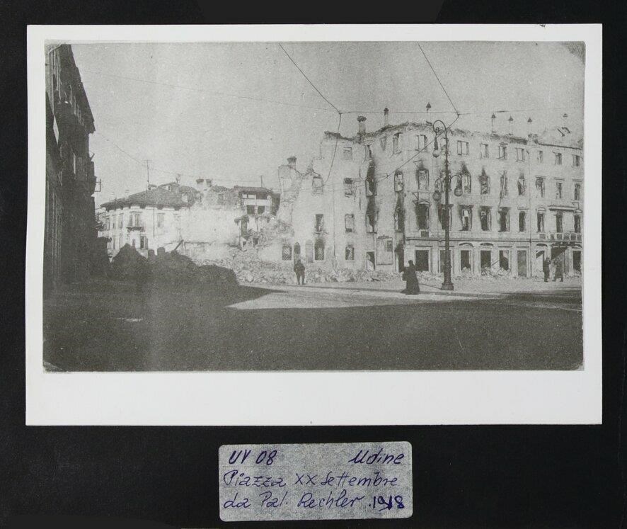 Udine, piazza XX Settembre: macerie degli edifici dopo l'invasione austriaca nel corso della prima guerra mondiale (vista da Palazzo Antivari-Kechler). Sono presenti quattro persone mentre camminano nella piazza.
