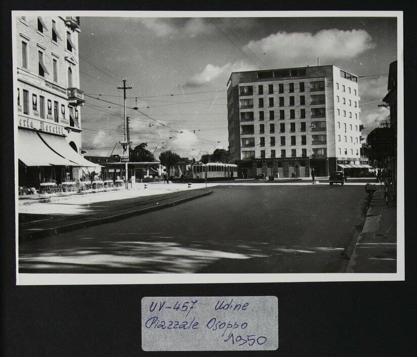 In secondo piano a destra, l'edificio ex sede della CRUP (Cassa di Risparmio di Udine e Pordenone, al piano terra) dell'architetto Ermes Midena (1940-1950). L'edificio è sviluppato su otto piani nel rispetto della tipologia a blocco. Vicino, il tram.
