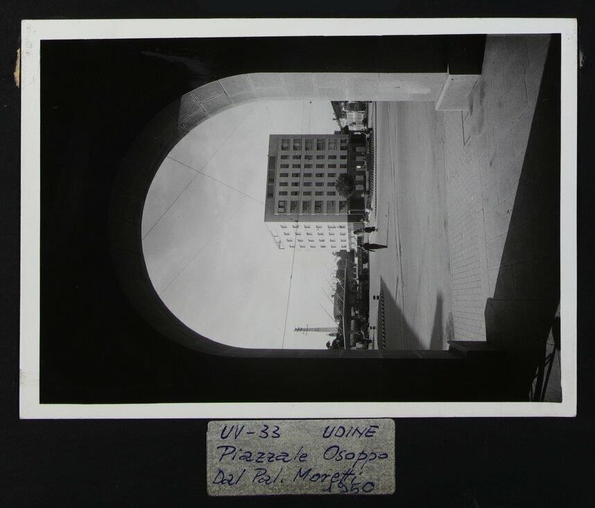 Udine: scorcio di piazzale Osoppo, quinta cerchia muraria. Da una delle arcate del pianoterra di Palazzo Moretti, dell'architetto Ettore Gilberti (1930-1932), veduta dell'edificio ex sede della CRUP (Cassa di Risparmio di Udine e Pordenone, al piano terra) dell'architetto Ermes Midena (1940-1950). L'edificio è sviluppato su otto piani nel rispetto della tipologia a blocco. Sono presenti nel piazzale le rotaie del tram.