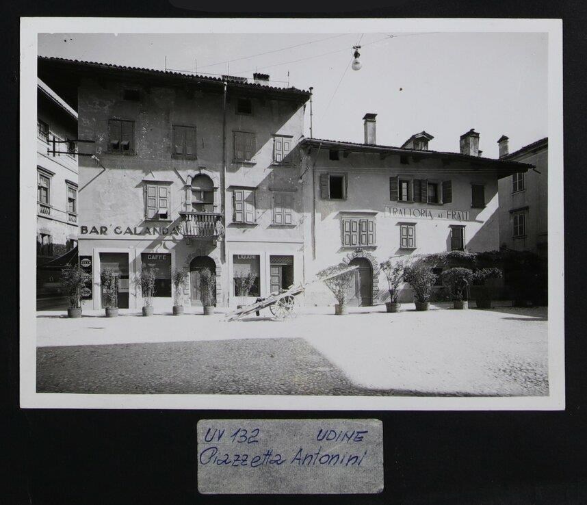 Udine: veduta di piazzetta Antonini, lastricata in ciottoli. A sinistra, la trattoria Ai frati, aperta nel 1809 davanti a Palazzo Antonini-Maseri in un edificio storico di fine Duecento. A destra, il bar Galanda, attività di caffetteria e vendita di bevande, tra cui liquori. Sul lastricato, a sinistra, cinque vasi con piante. Al centro, un carro. A destra si intravede Palazzo De Brandis (1292).