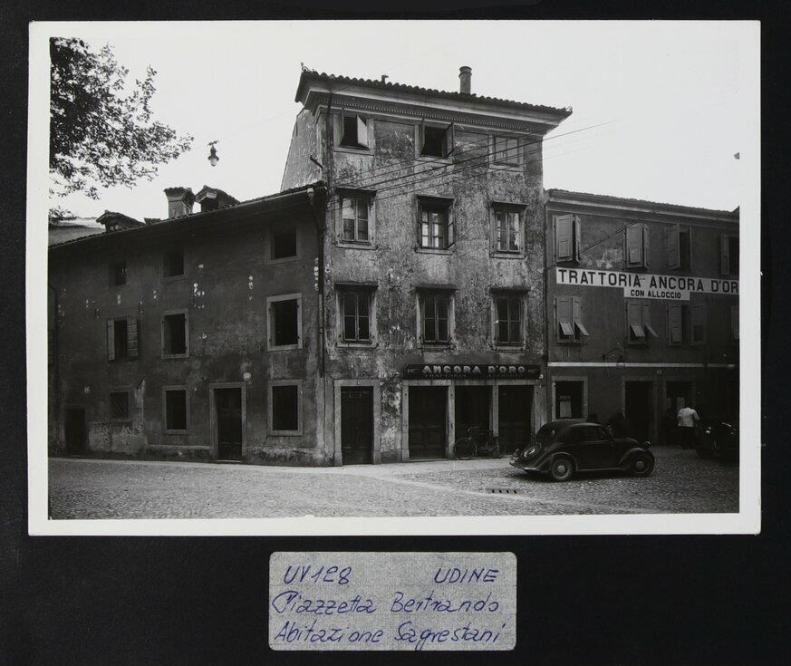 Udine, veduta di piazzetta Beato Betrando, su cui si apriva uno degli ingressi del duomo. L'edificio ripreso, come si evince dalle due insegne, accoglieva la trattoria "Ancora d'Oro con alloggio", demolita nel 1955. In basso a destra, un'automobile d'epoca.