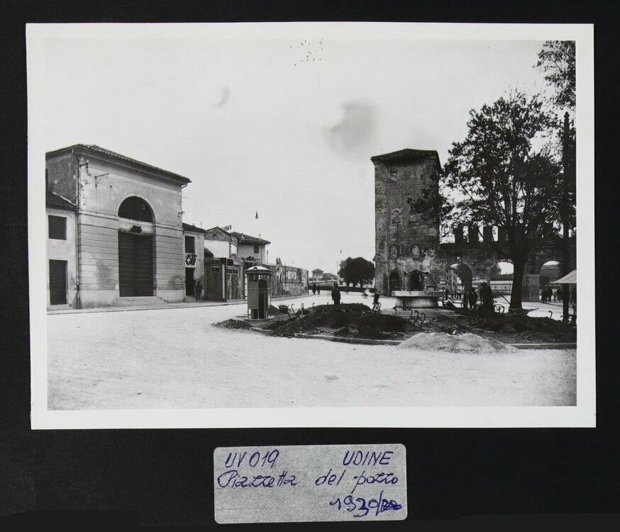 Udine: piazzetta del Pozzo. A destra, cisterna con una lastra di ferro come copertura (primi anni del Cinquecento) e, dietro, la torre medievale di Porta Aquileia (metà del Trecento), quinta cerchia muraria.