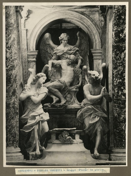 Riproduzione fotografica di un gruppo scultoreo raffigurante la Pietà con, al centro, il corpo morto di Cristo sorretto da un angelo all'interno di una nicchia, ai lati altri due angeli. L'opera è conservata presso la Chiesa di Santa Maria Maggiore a Cordenons.