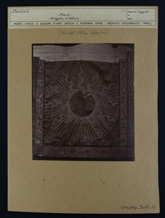 Bertiolo, chiesetta della Santissima Trinità: tovaglia d'altare. Sui quattro lati è presente una decorazione ricamata e, al centro, all'interno dell'immagine del sole, si trova la scena dell'Annunciazione.
