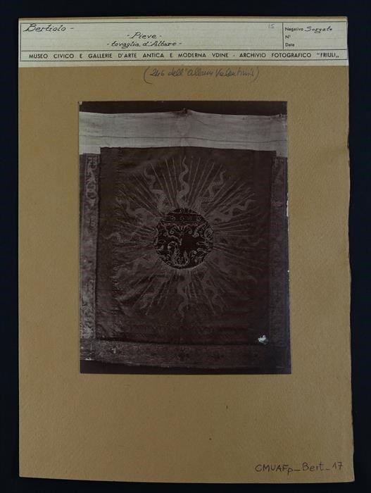 Bertiolo, chiesetta della Santissima Trinità: tovaglia d'altare. Sui quattro lati è presente una decorazione ricamata e, al centro, l'immagine del sole.