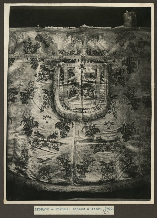 Riproduzione fotografica di un piviale bianco con decorazioni floreali e conservato presso la Chiesa di San Giacomo Apostolo di Sedrano.