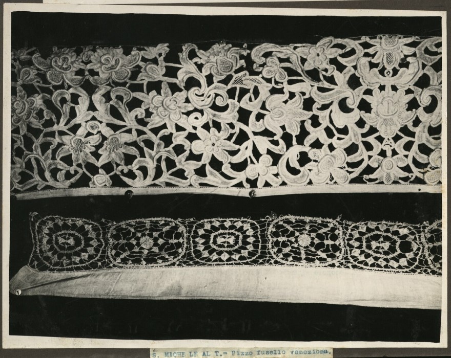 Riproduzione fotografica di un paramento liturgico con pizzo a fusello veneziano e conservato presso la Chiesa di San Michele Arcangelo a San Michele al Tagliamento.