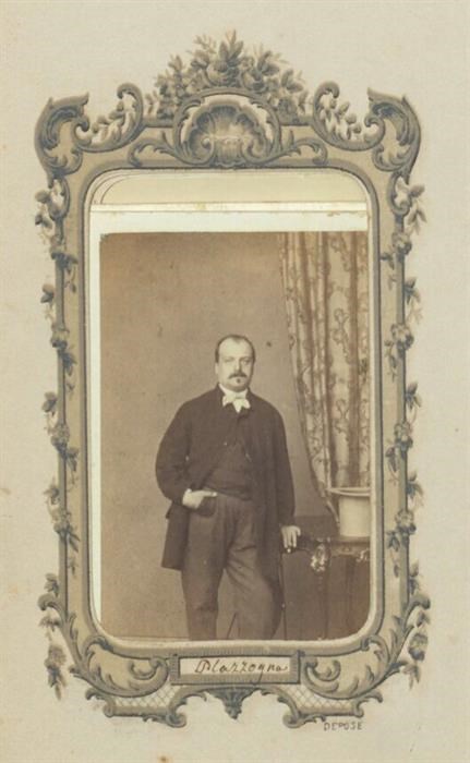 Ritratto, in studio, del signor Plazzogna accanto ad un tavolino con sopra un cappello a cilindro