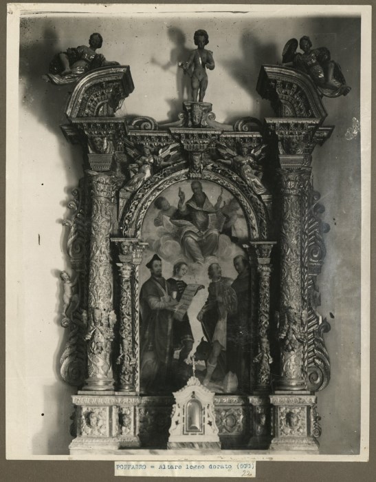 Riproduzione fotografica di un altare ligneo dorato con pala dipinta. L'altare, riconducibile a maestranze veneto-friulane, è composto da due colonne maggiori e due minori con decorazioni fitomorfe ed incorniciano la pala. In basso al centro un tabernacolo mentre in alto delle statue di angeli. Nella pala dipinta delle figure di santi.