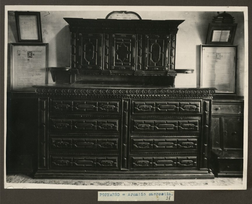 Riproduzione fotografica di un armadio canterano databile al XVII secolo e conservato presso la sacrestia di una Chiesa a Poffabro. Caratterizzata da due corpi sovrapposti, nella parte inferiore presenta 8 cassettoni divisi su due colonne; la parte superiore presenta tre ante.