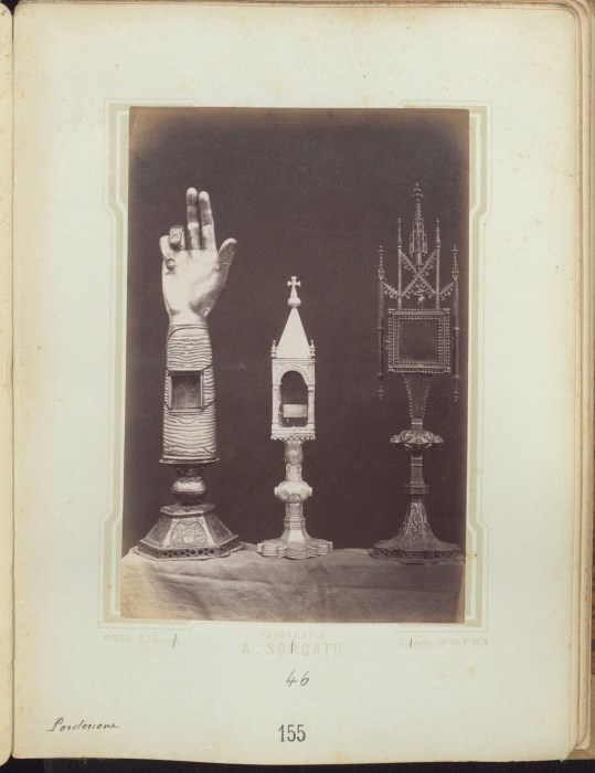 Tre reliquiari appartenenti al Tesoro del Duomo di Pordenone. Quello più a sinistra è il reliquiario di San Gottardo del XVI secolo a forma di braccio con mano benedicente, gli altri due reliquiari datano al XIV e XV secolo. In particolare quello più a destra è il reliquiario di San Maurizio, a ricettacolo quadrato (XV secolo), con piccole guglie e perle.