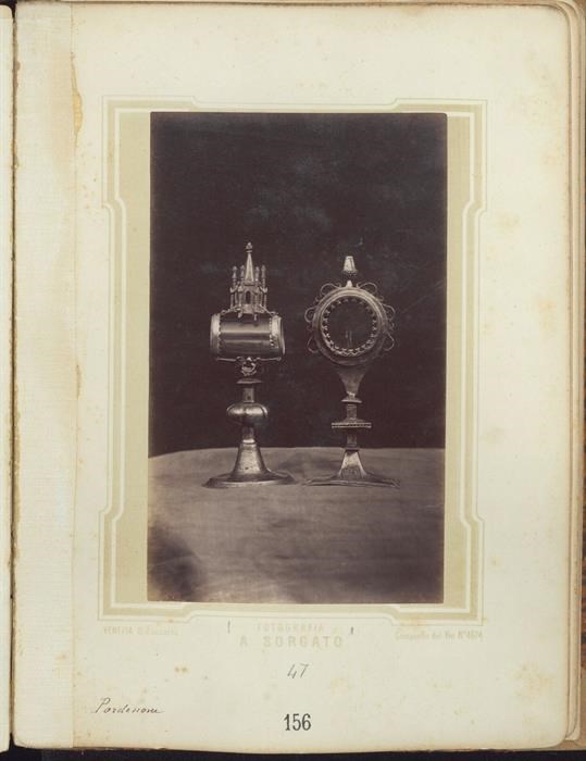 Due reliquari appartenenti al Tesoro del Duomo di Pordenone, uno a forma di ostensorio l'altro a fiala orizzontale.